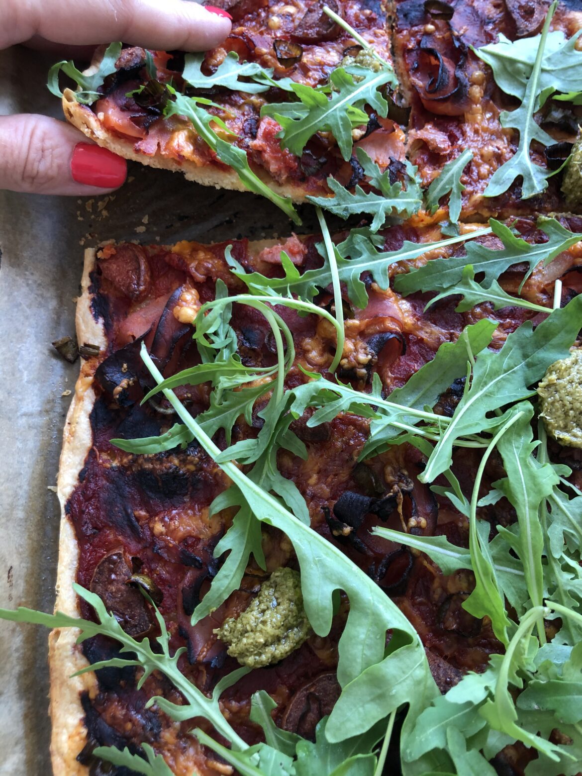 - Da pizzaen var færdig pyntede jeg med rucola og pesto.